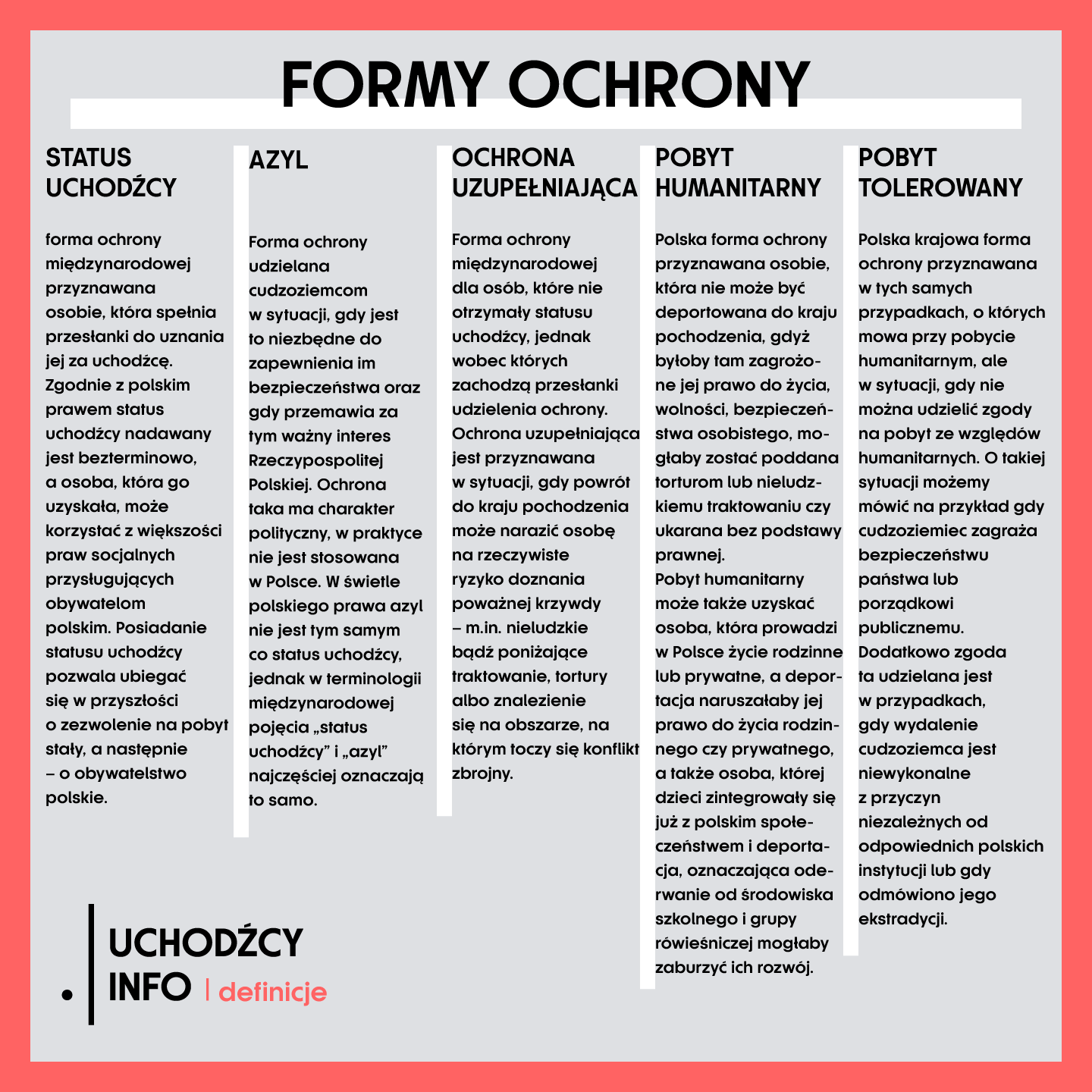 Cudzoziemiec, który ucieka z kraju swojego pochodzenia, ma możliwość otrzymania kilku form ochrony międzynarodowej. Najstarsza to wspomniany już status uchodźcy, który powstał w następstwie fali migracji po II wojnie światowej. Inne przedstawione są na poniższej infografice.